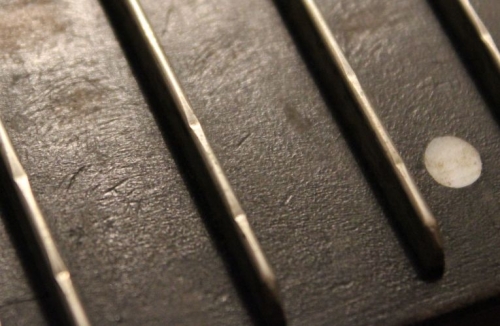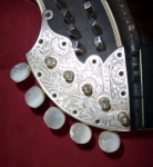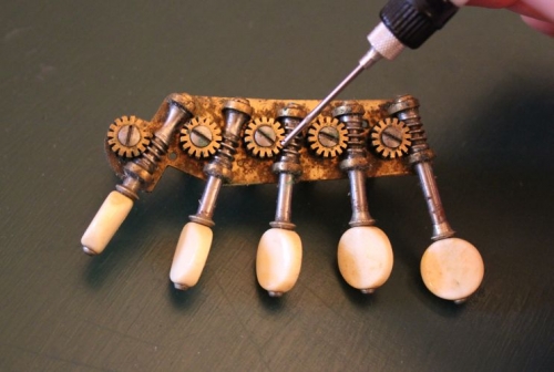 Wir verwenden Wirbel in verschieden Stärken mit rundem und flachem (alte Wienerform) Kopf, vernickelt oder brüniert (antikes Aussehen). | |  | Griffbrett abziehen Durch den Fingerdruck auf den Griffbrettsaiten gräbt man im Lauf der Zeit tiefe Furchen/Kerben in die Bünde. In der Regel sind diese auf den meist gespieltesten Tönen der a- und d-Saiten. Diese Furchen haben unangenehme Nebengeräusche (Schnarren) und Intonationsverfälschungen (im Volksmund "Bundunreinheit") zur Folge. Sobald die Saite nicht mehr auf dem rundgefeilten Bund aufliegen kann, sondern in der flachen Kerbe liegt, muss das Griffbrett abgezogen werden.