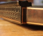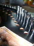In unserer Werkstatt fertigen wir noch in bewährter Weise Schellackpolituren, egal ob vom Furnier aufbauend oder Aufpolieren und Glätten der oberen Lackschichten. | | | Saitenhalter-Zähne flicken Ein lästiges Problem bei eingesägten Saitenhaltern: es brechen durch unsachgemäßem Anstoßen leicht sog. Zähne heraus. Diese zu ersetzen erfordert großes Geschick: kleine Holzstücke exakt in der ursprünglichen Stärke müssen angepasst und zuletzt so lackiert werden, dass man die neuen Zähne nicht mehr von den alten zu unterscheiden vermag. | | | Randeinlage ersetzen Ausgebrochene Randeinlagen müssen durch gleichartige neue ersetzt werden. Oft ist es nicht leicht, gleichartiges Material aufzutreiben. Durch etwaige Tricks kann man sich jedoch auch hier helfen...